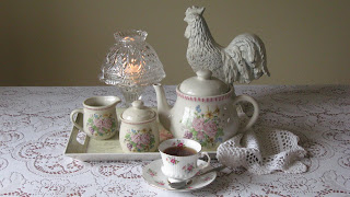 Today, I want to show you one of my tea sets. I have several tea sets but because this one has pink on it, I thought I would share it. Don't mind the rooster, he just likes getting his picture taken!
