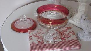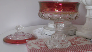 Today I would like to share with you my red-rimmed candy dish. It matches the punch bowl set and the salt/pepper shakers I shared with you in earlier posts. They had stopped producing this glassware and when I saw this in a thrift store, I was overjoyed!