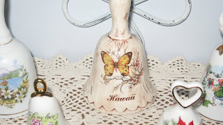 The white bell with the flowers and blue lake on it, was a gift from the young man who came from Vancouver, BC to stay at our home with his youth group. Then the last little bell "For My Love" was also a gift from my hubby. Each of my bells holds sentimental value and I love each one!