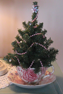 My little Christmas tree decked out with pink beads and rhinestones, sitting in a Rose Chintz teacup.