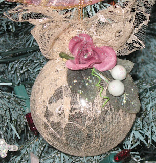 A lace-covered ball trimmed with a pink rose.