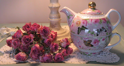 I am serving tea in this pink floral teacup today. It is a set adorned with pink roses and other florals and I thought it would be perfect to take tea in today.