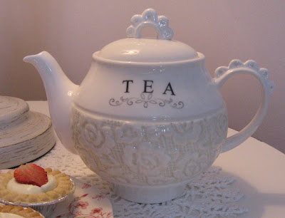 The other day when I was out and about, I saw this cute little tea pot. I had to bring it home with me because it is different from anything else I have. The roses are raised on it and I like the inscription "Tea" on it too. Normally, I would tell you where it was made and by whom but there are no marks on it. So, I will just share its cuteness.