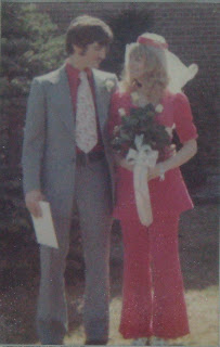 I had a friend make my wedding outfit. I had chosen a beautiful velvet material in my favourite colour. Dress-pantsuits were very much in vogue then so that is what I chose to wear. The dress-pantsuit had a sweetheart neckline with ruched sleeves and the pants were bellbottoms. My friend had made me a matching headpiece as well and I wore a cameo choker at my neck. It was a very practical outfit because I was able to wear it for several years afterwards! Yes, I wore pink on my wedding day!
