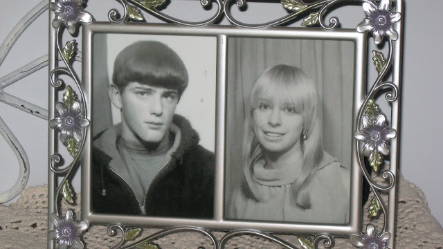 We met at the Eaton's department store which is much like the Sears store, and afterwards, we went and had our pictures taken. You remember the booth where you put in a quarter and you got some snap shots? These are our pictures from our first date. Isn't he cute with his Beatle haircut? Look at my bangs! That was the style though.