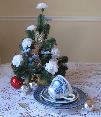 This centerpiece was a birthday gift from a friend a few years ago. I bring it out every Christmas season. It is so pretty with its blue and white flowers, little deer, and pinecones!
