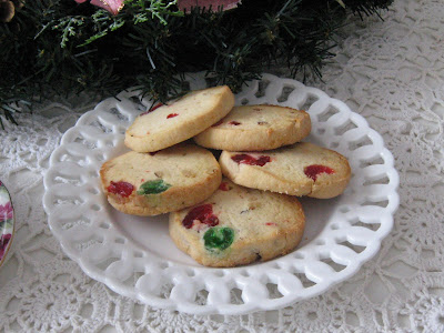 I am enjoying an Icebox cookie with my tea. These cookies are buttery and filled with cherries and nuts; yum!
