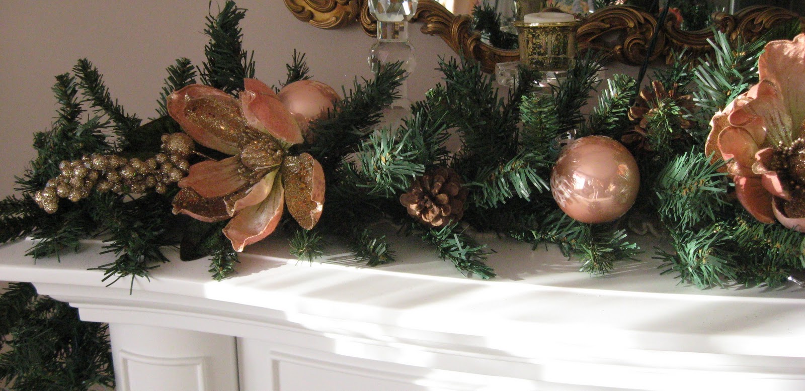 My mantel in the daytime. Fairy lights, mercury glass votives, pink balls, pinecones, and glittery pink magnolias make up this mantel display.