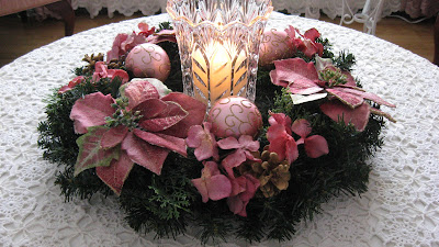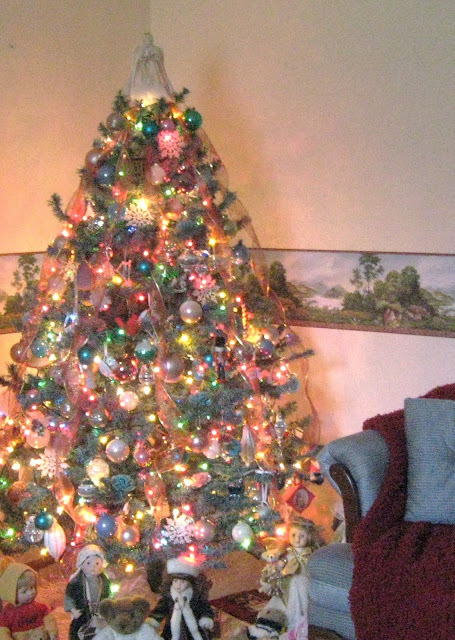 And finally our Christmas tree which is in the family room this year. It is covered in ornaments collected over almost forty years. Most are gifts from family members and friends and they hold much sentimental value. Burgundy and gold sheer ribbon is used on the tree and a collection of dolls and teddy bears wait beneath its branches.
