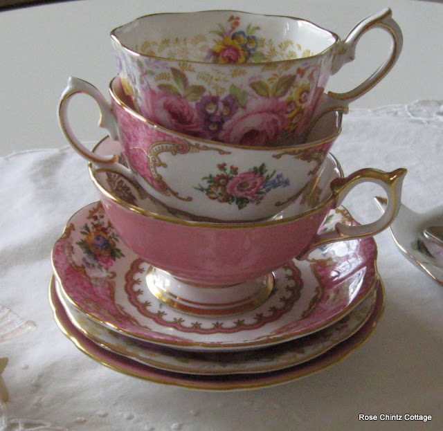 I love the look of stacked teacups, don't you? Especially when they're pink!