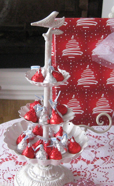 Hershey's Kisses fill the tiered stand.... Hmm, I see there are a few missing!