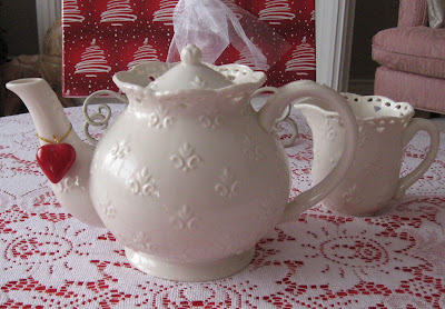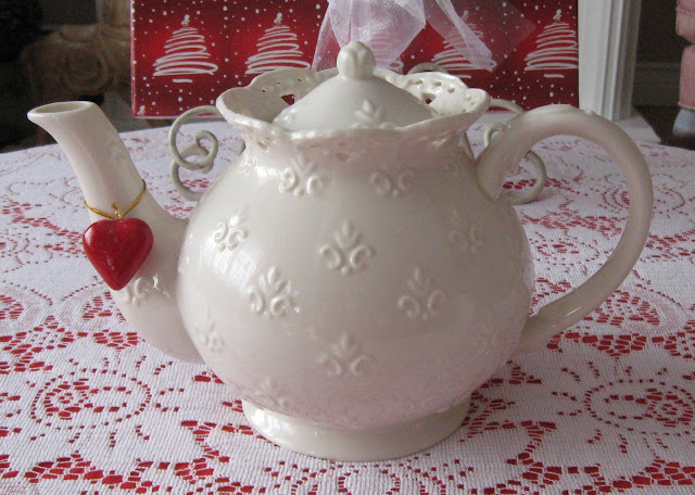I'm using my Cream Lace teapot today. This pattern is by Skye McGhie which you've seen before. I think this teapot is so romantic with its Fleur de lis and lacy edged rim.