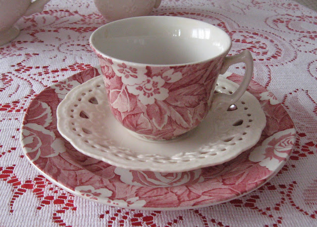Today I have my tea table set with an assortment of china patterns. As much as I adore soft pastels, I decided to do a mainly red and white theme today.