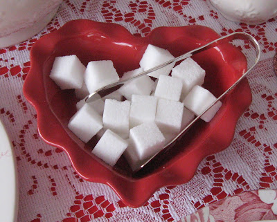 Sugar cubes are in a heart shaped candy dish to add a bit of whimsy.