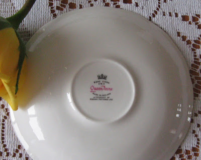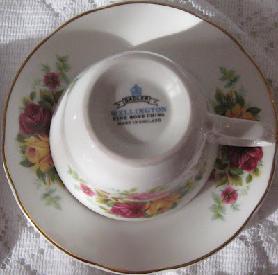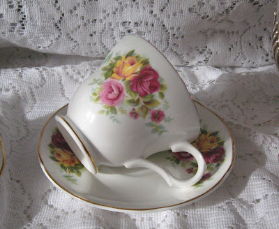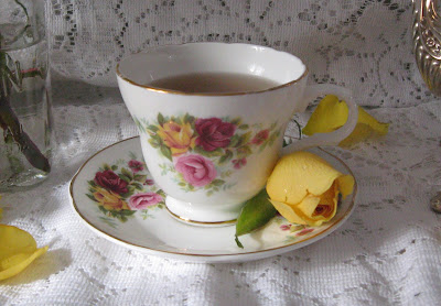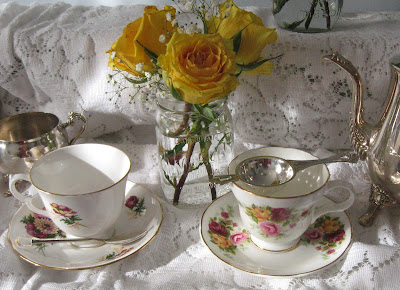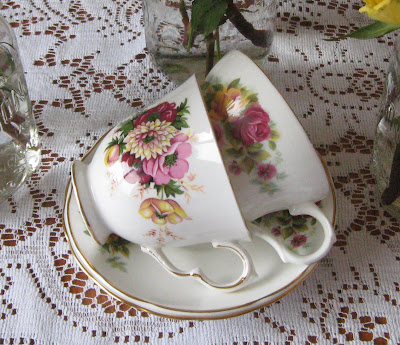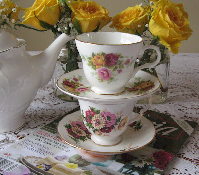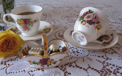 I was at the grocery store the other day and was captivated by the golden hue of these lovely yellow roses. They were half price so they came home with me. I knew just the teacups to share today. I thought the roses and teacups went well together.