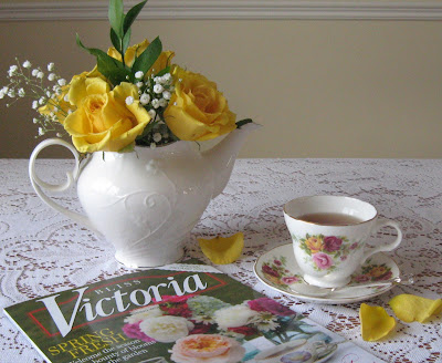 I decided to arrange some of my roses in my Verdici teapot too. Have you gotten your newest issue of Victoria? Oh, I do love these Spring issues! They are filled with loveliness from cover to cover.