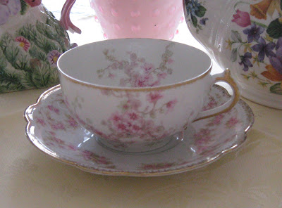 The pretty cup is Haviland. Sponged on gold and dainty flowers make this a delightful teacup. I think the cup and saucer married very well!