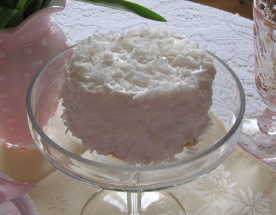 Fluffy coconut cake nestled under glass.... Two yellow mini cakes sandwiched together with lemon curd, then frosted with icing and sprinkled with coconut.