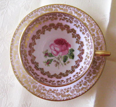 The delicate pink and gold of this cup is so lovely with a rose and two buds gazing up at you from the bottom of the cup.