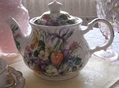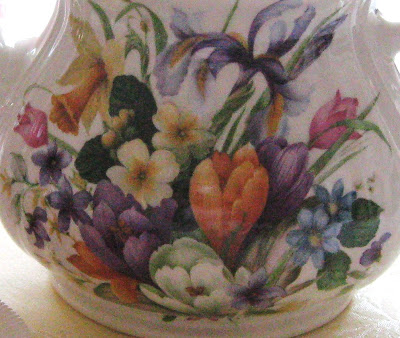 I'm using my Sadler teapot too which I won from Wendy at Once Upon A Rose Haven. This one is called Spring Crocus{Staffordshire, Eng.}.