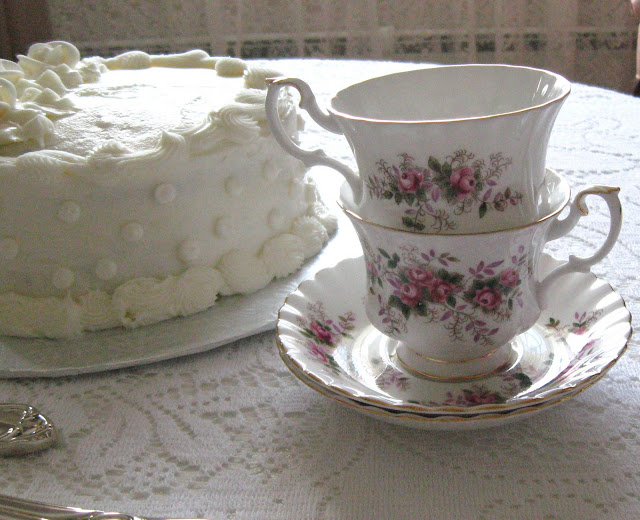 Lavender Rose teacups snuggle up to the cake.