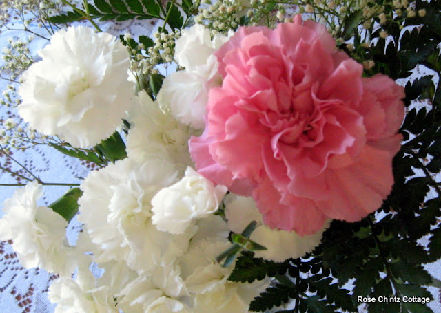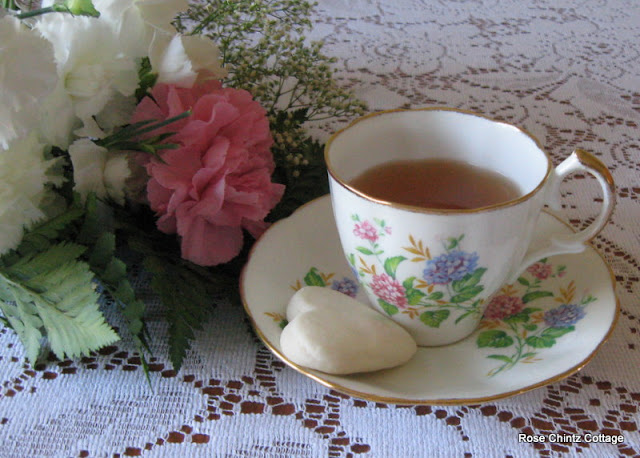 The teacup is sitting next to my pink and white carnations and sipping tea from it is simply lovely. Thank you Deb. Every time I look at it, I will think of you!