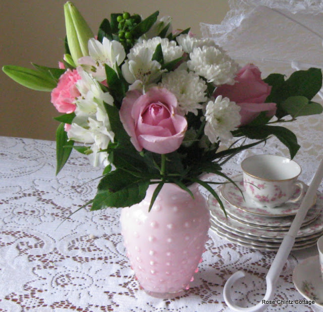 Welcome dear friends to my Summer Tea Party! What better way to celebrate Summer together than with a tea party? So come, let's Savour the Summer with some tea and lemonade! My beautiful bouquet sets the scene, roses, carnations, lilies, etc....