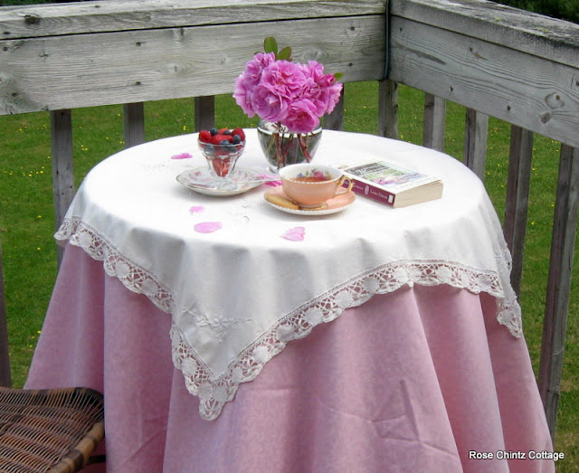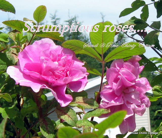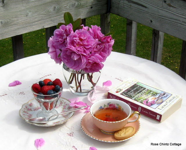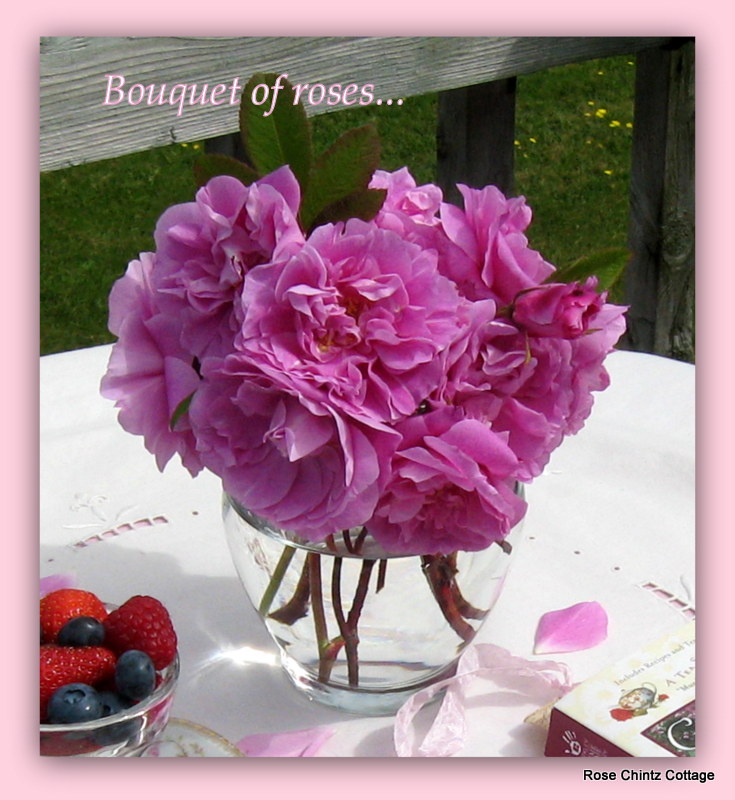 The rose bushes are just loaded with blooms right now and one must have flowers to grace the tea table. These roses were freshly cut from my bushes this morning. They are old-fashioned roses called Theresa Bugnet. They look like peonies, they are so full and lush, and their scent is heavenly!