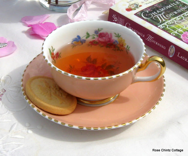 A cookie and a wee bit of fruit, a cup of tea in a pretty teacup, and another Laura Childs Tea Shop Mystery, Chamomile Mourning....