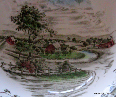 It is such a charming pattern with a pickett fence and red roses along the scalloped edge. The center of the bowl depicts a cozy village with a little church. Yup, looks like a Sandi bowl!