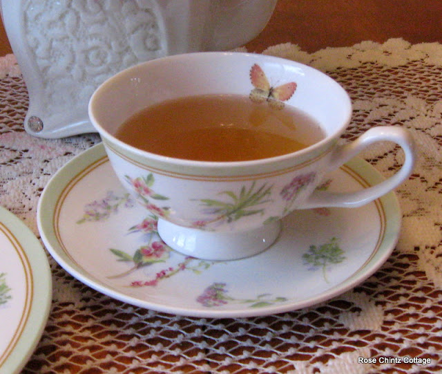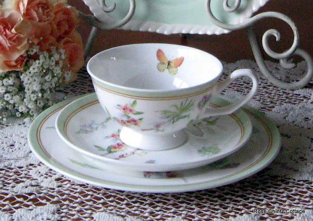 Now let's have some tea, shall we? I thought my Butterfly Garden trio would look nice with my 'new to me' green plate. Note the butterfly inside the cup.