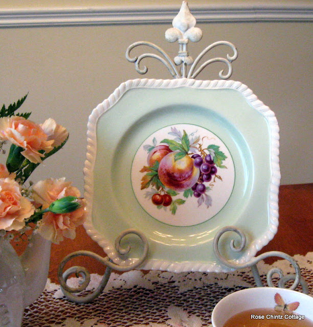 I was so pleased to find this square green plate by Johnson Bros.. I think the fruit on it is perfect for this time of year now that it is harvest time.