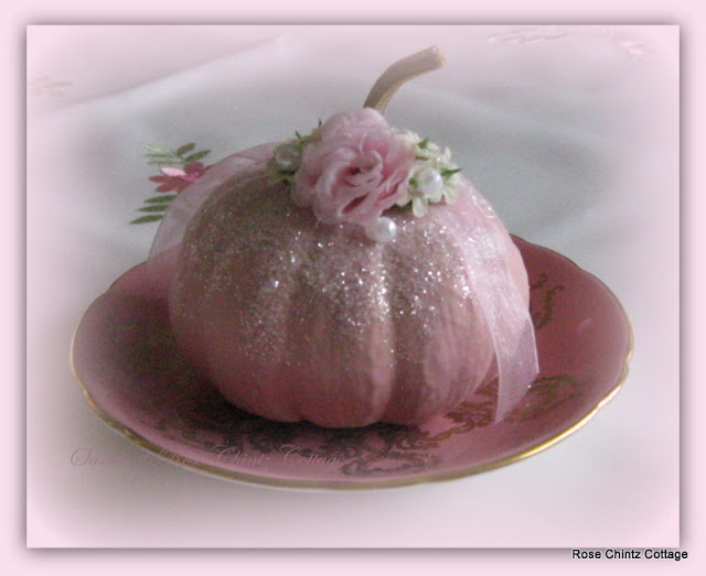 And here's another pumpkin. This is the real deal which I painted pink and glittered up. Then I tied pink ribbon around the stem and glued on the posies. Added some wee pearls and voila! Do you think Cinderella would approve?