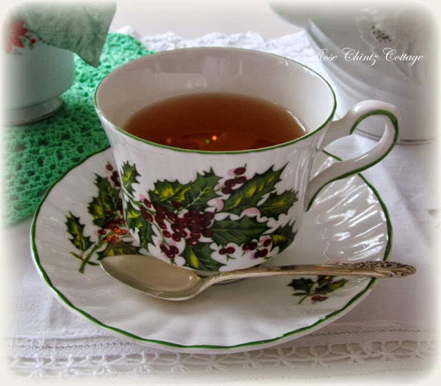 PG Tips is my choice of tea today. This is a nice orange pekoe served in my Royal Stafford teacup. Made in England, this teacup has no gold on it but instead a Christmas green trim and holly berries adorn the cup and saucer.