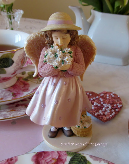 This darling little angel who is smelling her posies was an early Valentine gift from my hubby. You can't tell from the picture, but her wings sparkle. The sweet bouquet she holds in her hands as well as the posies in the basket at her feet, all sparkle.
