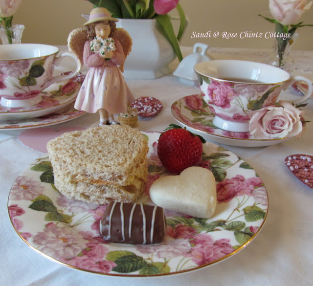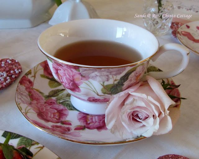 I am using my Valentine teacup today; a wee bit of pink and red together in the form of pretty hearts sprinkled about both the cup and saucer.