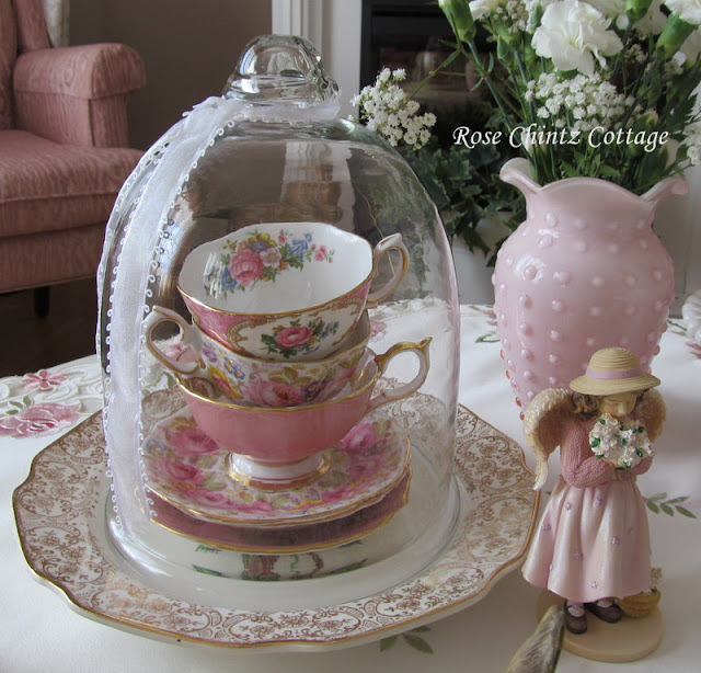 Under the cloche, I have my Lady Carlyle, Serena, and Princess teacups waiting for the Victoria Garden tea to steep.