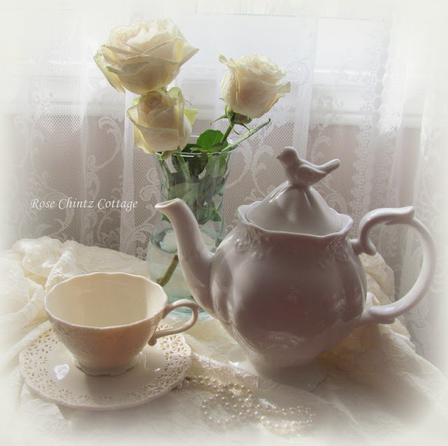 I found it so romantic and peaceful that I decided to pull down my white Gracie China teapot with its sweet birdie perched on top....