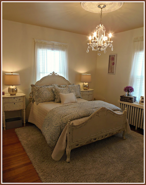 Janet @ Rosemary-Thyme shared a fabulous makeover in one of her guest rooms. She used chalk paint to transform the furniture. A beautiful chandelier and medallion adorned the ceiling and lovely linens on the bed made it cozy and inviting.