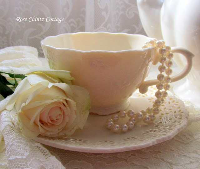 This week at my tea party I set a tea table with creamy whites and roses. A soft and serene tea time after the hustle and bustle of Easter.