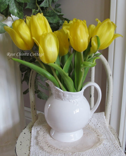Now, I would like to dwell on that which is lovely....I had bought some beautiful bright buttery yellow tulips at the grocery store. Tulips say Spring so well, don't they?