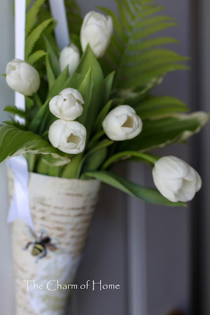 Sherry @ The Charm of Home created this lovely May Day cone. I love the white tulips and script-y cone adorned with the bee. So pretty!