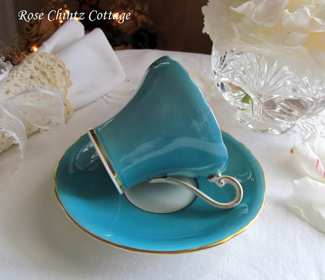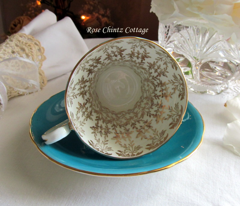 She's an elegant and shapely cup in a deep shade of turquoise with a handle, rim, and saucer trimmed in gold.