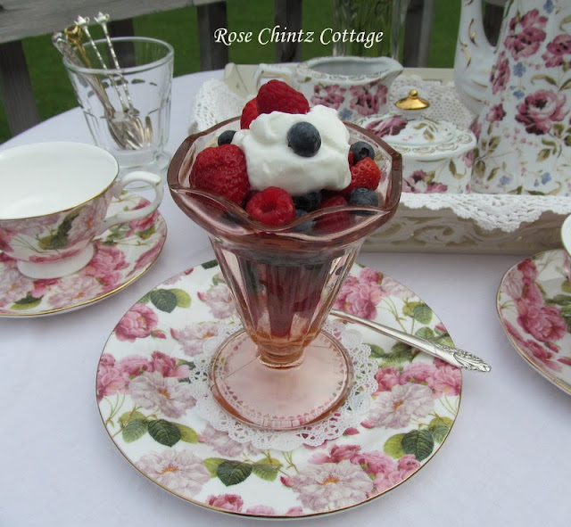 It's a warm day so I am serving fresh berries with a dollop of vanilla yogurt on top. The parfait glass is vintage pink depression glass and was a gift of two from my hubby.
