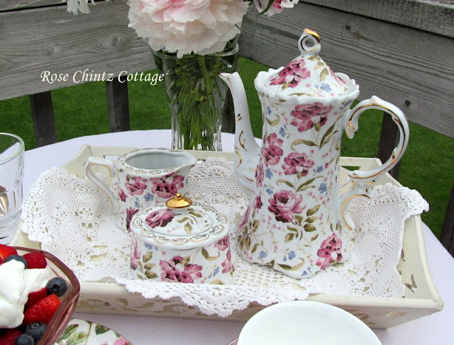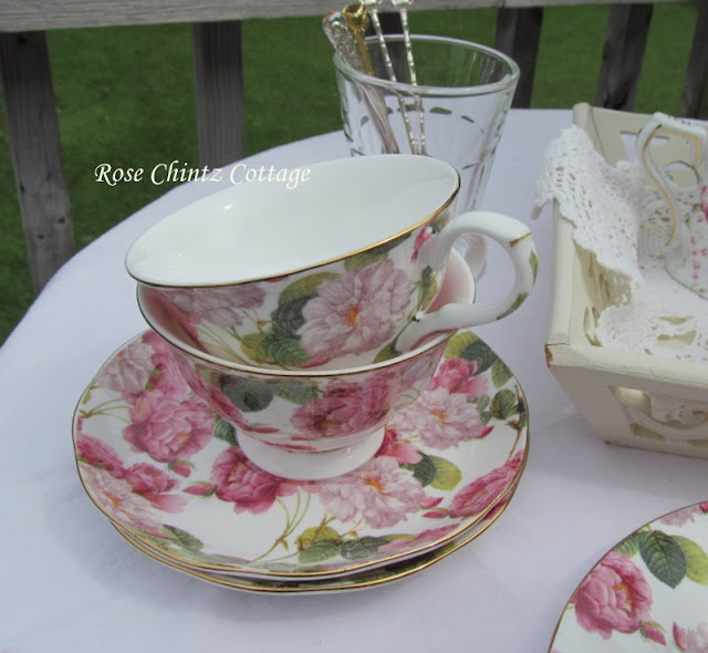 It's a beautiful day so let's sit out on the deck. I have set the table with my posies and the pretty coffee set I found at our Anne of Green Gables Store a couple of years ago. Some of my rose bushes are behind the deck but you can't see them.