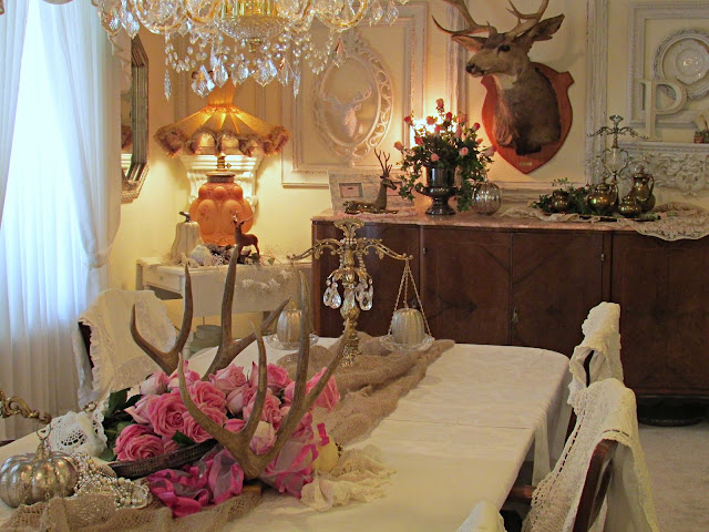 Penny @ Penny's Vintage Home shared her beautiful dining room complete with antlers, lace and roses, burlap and pumpkins, and a deer head.