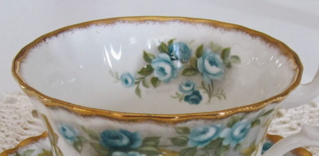 As you can see from the photo, my Royal Albert teacup is called Veronica and it is so pretty with delightful aqua hued roses and gold trim. A cluster of roses adorn the inside of the cup as well.