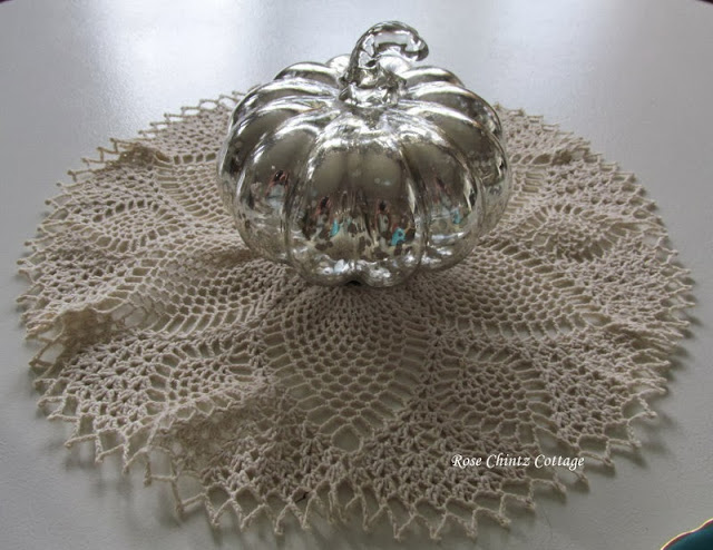Pretty things make me happy, how about you? Just a little touch of loveliness here and there in your home can go a long way in making your home a cozy place to be. A mercury glass pumpkin helps!