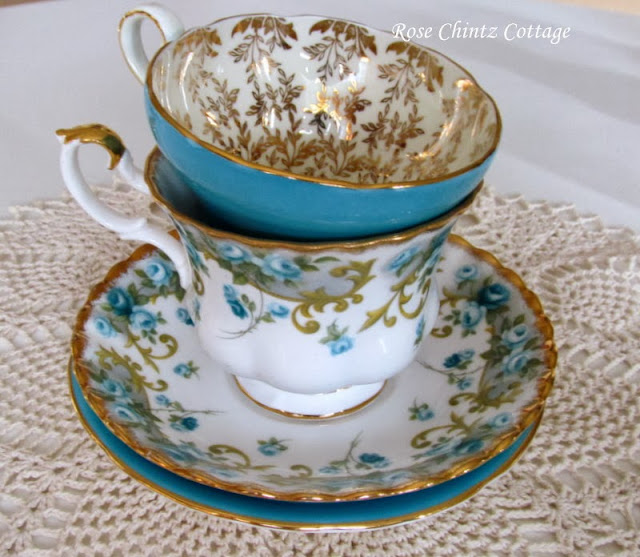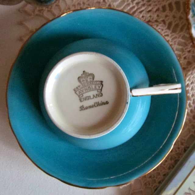 Also joining the party is my Aynsley teacup dressed in turquoise and leaves of gold inside the cup.