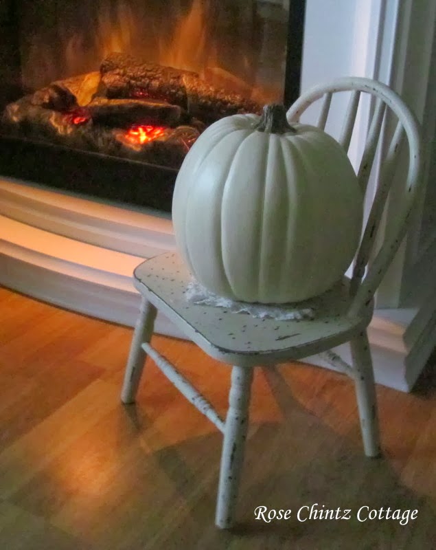 Yesterday we had a heavy downpour of rain and it was dark and gloomy in the house so I poured a cup of coffee and curled up in a chair by the fire. The pumpkin on its chair looks completely different bathed in fire light.
